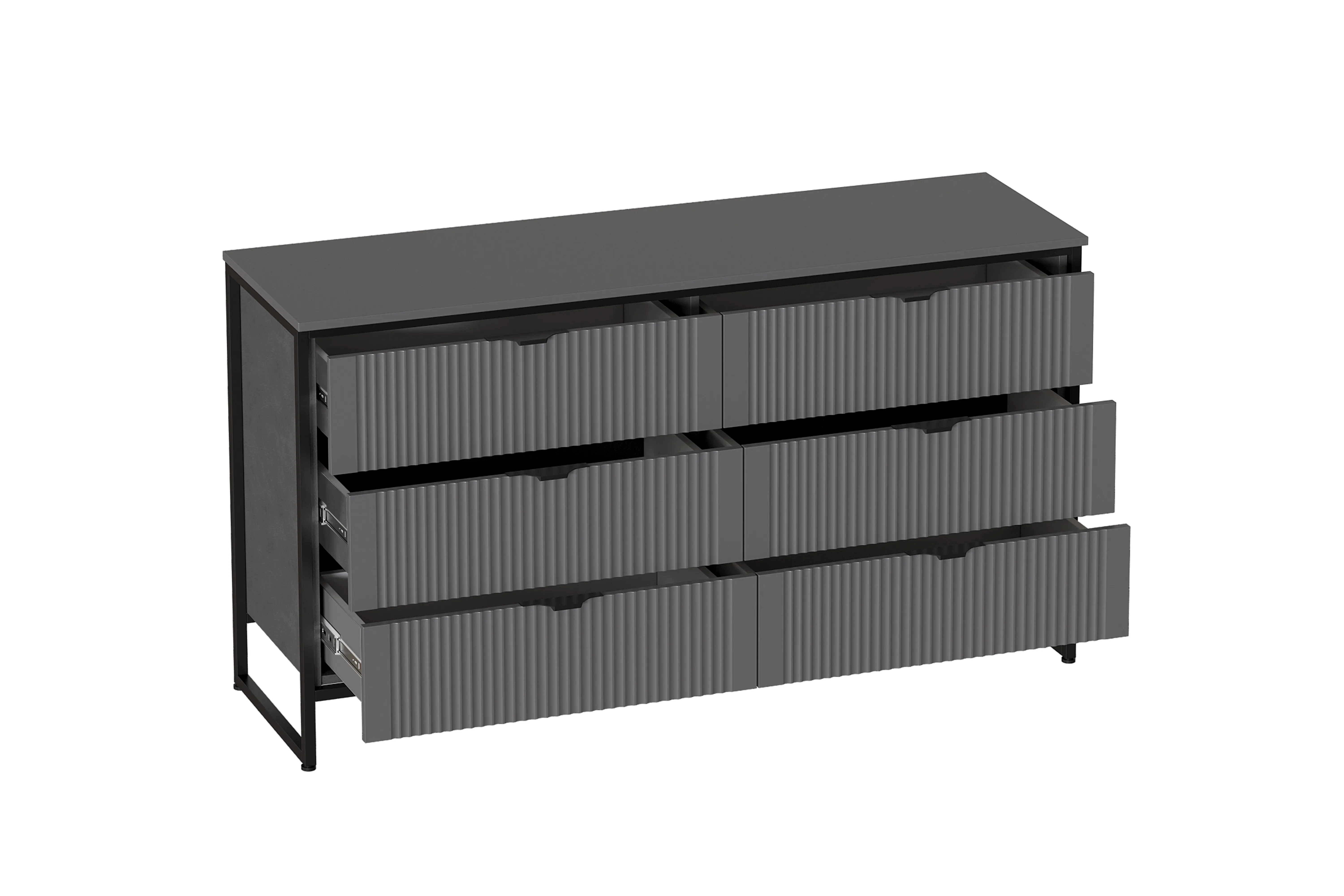 Комод "Нора" на металлокаркасе состоит из выдвижных ящиков, что позволяет удобно хранить вещи и поддерживать порядок в комнате. Внутреннее пространство разделено стенкой на два отделения, в каждом из которых установлены по три выдвижных ящика на шариковых направляющих с доводчиками. Он выполнен из безопасных, качественных материалов (лдсп и мдф), что гарантирует долговечность и сохранение первоначального вида на протяжении долгого времени.