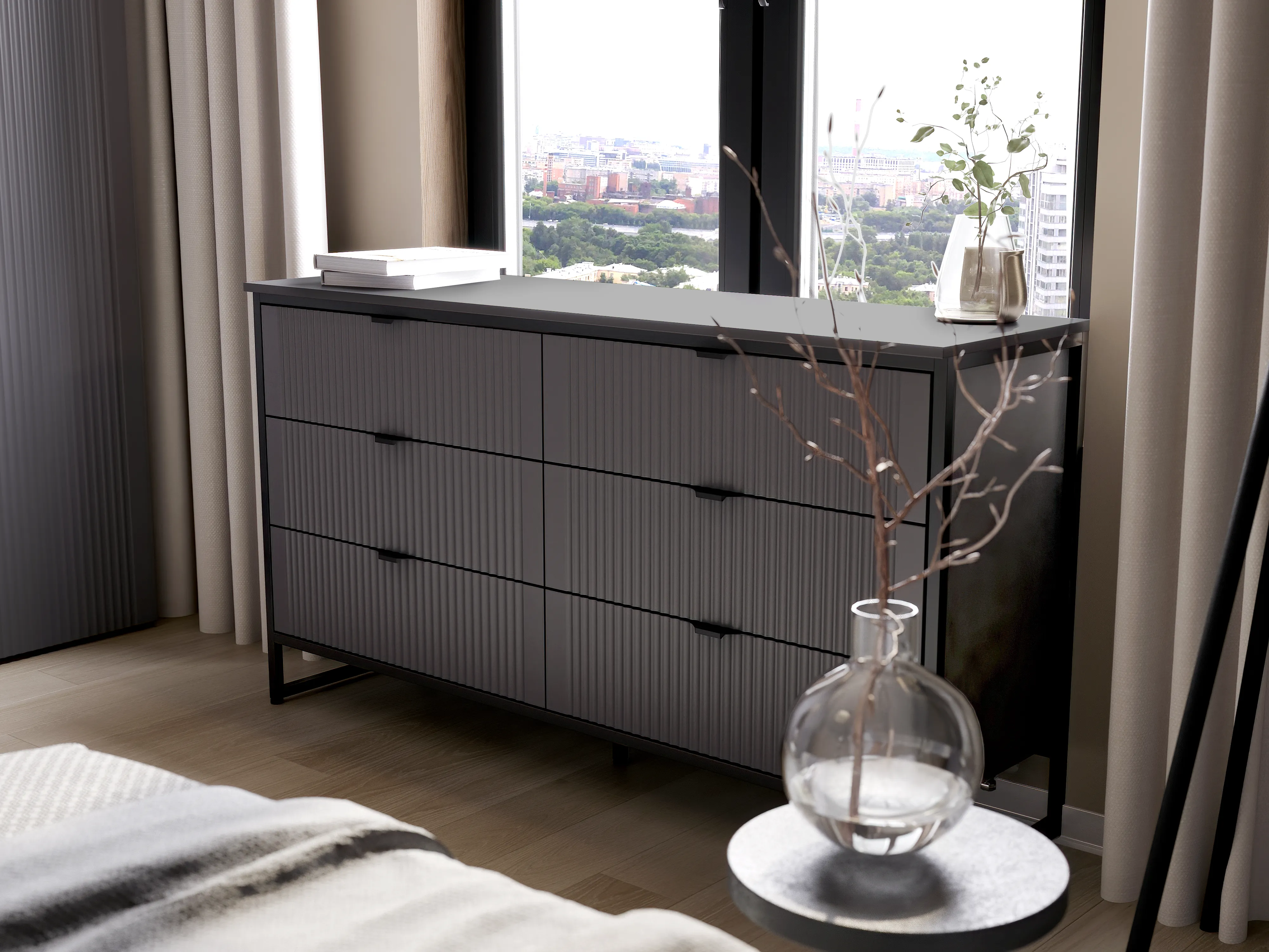Комод выполнен в двух вариантах исполнения: Металл Бруклин / Графит и Персидский жемчуг / Персидский жемчуг.