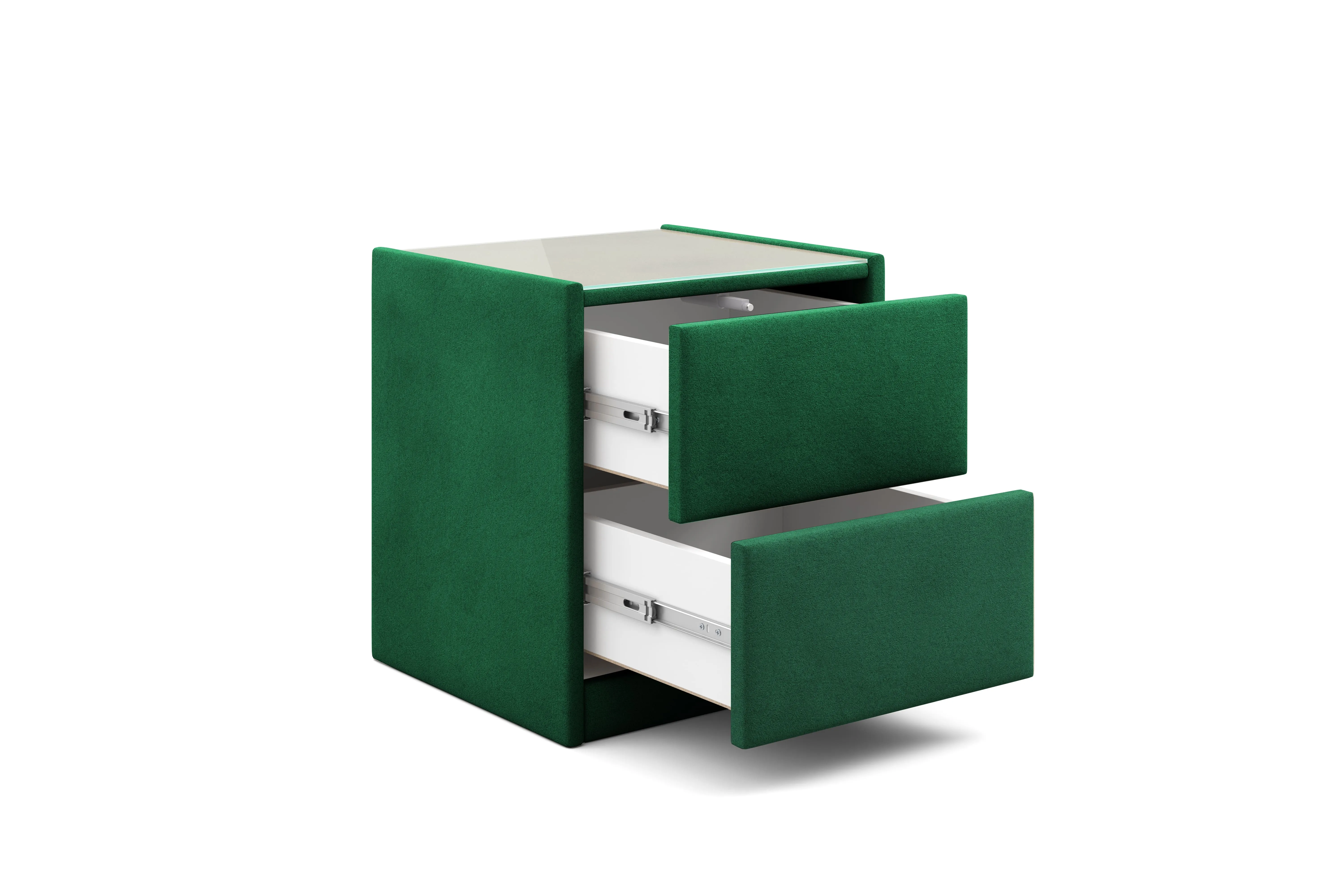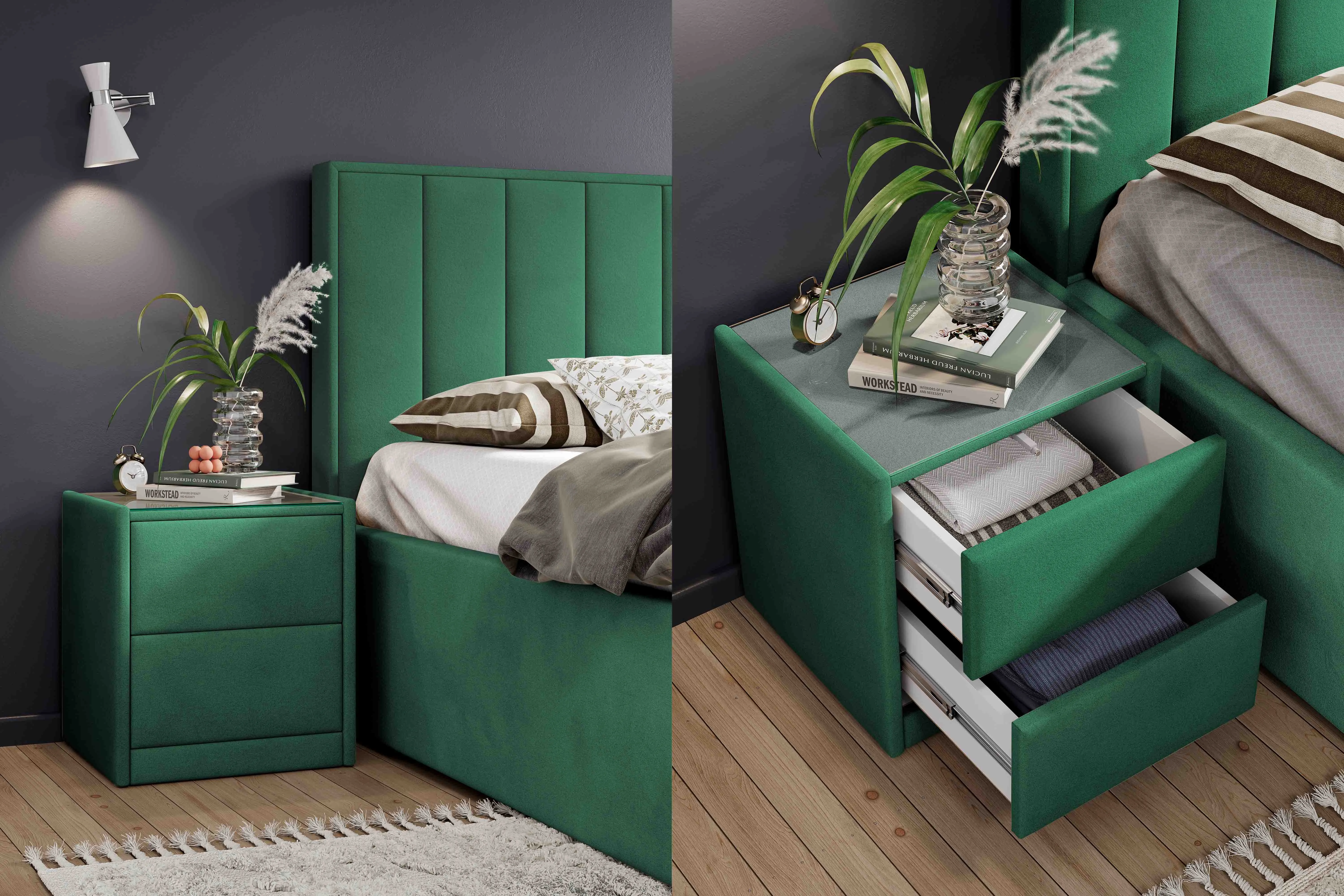 Тумба обтянута высококачественным велюром, что придает ей особый уют и комфорт. Имеет стеклянную столешницу и два вместительных выдвижных ящика с механизмом Push to open. Скругленные торцы модели, минимизируют риск удариться в темноте.