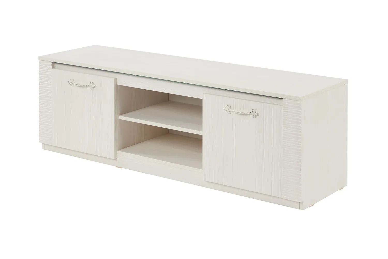 Тумба по ТВ имеет две ниши, закрытые дверцами и центральная открытая с одной съёмной полкой. Под крышкой установлена стеклянная панель для крепления светильников "HLT Prismatic FT".